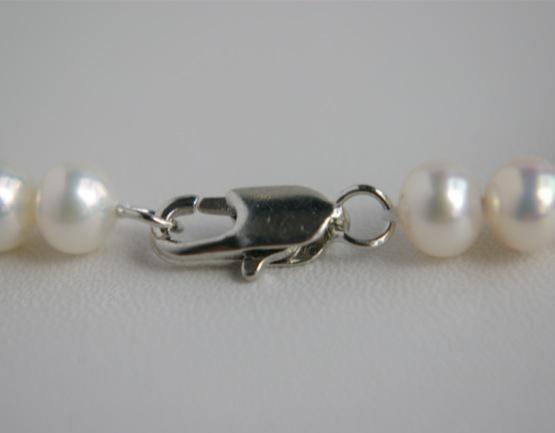 小粒パールネックレスのノット無し加工の場合、こちらの小さめの金具になります(銀色メッキ)。約5mm×長さ15.5mm前後