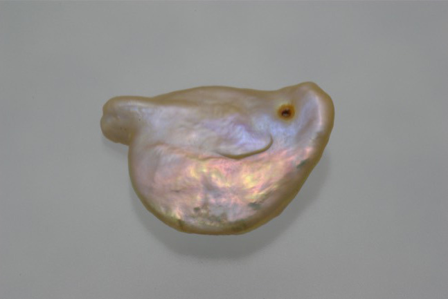 淡いオレンジピンクが可愛い一点もののバロックパールです。 大粒のコイン形の核がベースになっていると思われ、丸みを帯びたユニークなフォルム 片側は真珠層が滑らかに巻いており、もう片側は帯状の凸部と点状の天然キズがあり、虹色の光沢(干渉色)がよく出ています 。面白いことにこのキズがちょうど鳥の目、帯状のところが羽のように見え、まるでまるまる太ったウズラのようで可愛いです。