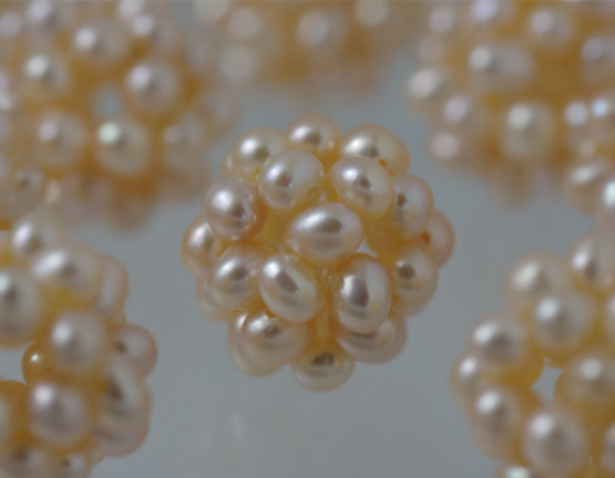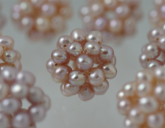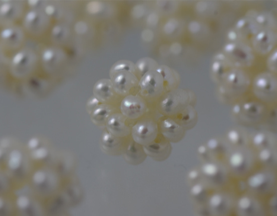 3mm前後の小粒の真珠を贅沢に使って編み上げた球状モチーフです(編み糸はテグス)。